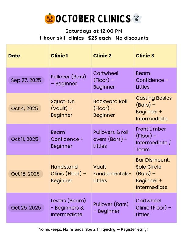 Our Skill Clinics are focused training sessions designed to help gymnasts improve or master specific skills. These special events run between 1 hour and 1.5 hours, depending on the complexity of the skill being taught.